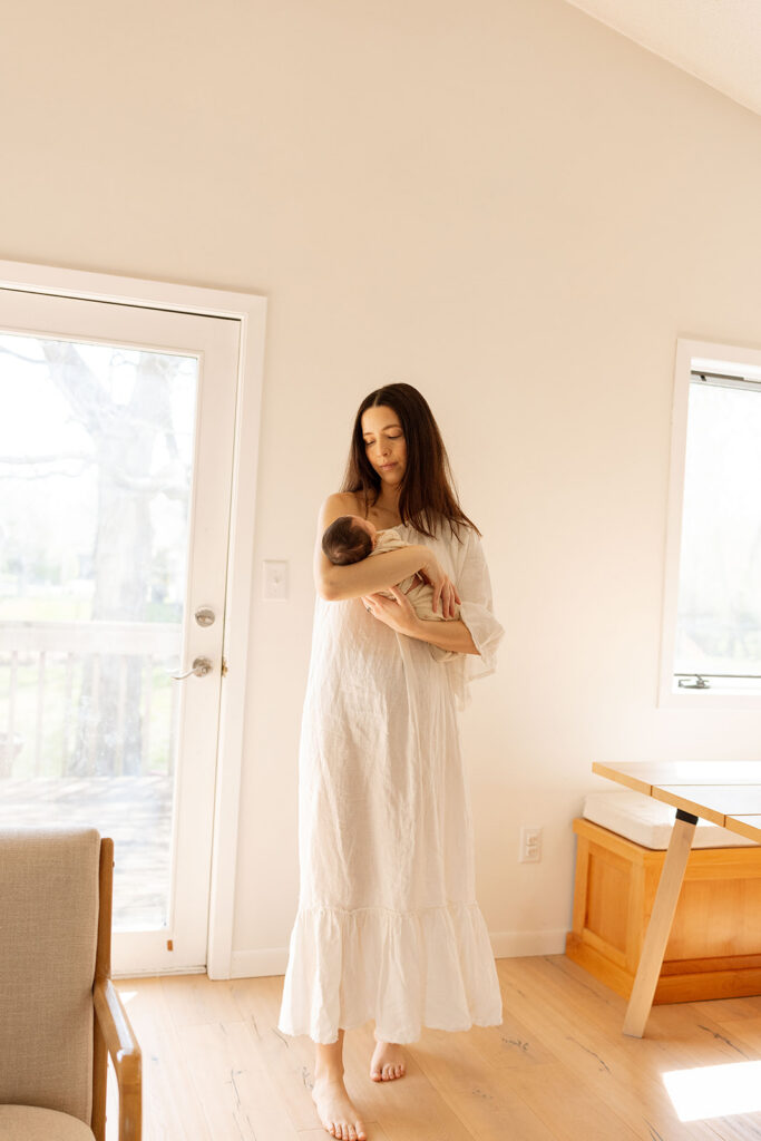 4. Flexibility. I’m not talking about yoga here. In home lifestyle newborn sessions don’t have as narrow of a window of opportunity for timing compared to posed studio sessions. Because I don’t mind-actually I kind of love-an alert newborn, your baby can be older than the general time-frame (7-10 days) recommended by photographers posing newborns in a studio. Newborns tend to be most happy in your arms so they tend to settle easier. So don’t stress-even if you just want to spend another week adjusting to life at home with this new little one, I will work with you to schedule your session.